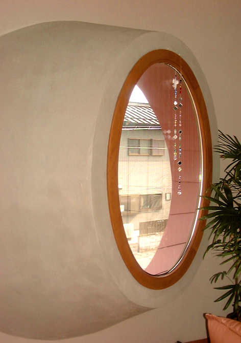 施主さんがわたしの設計した"楕円窓の家"を見て非常に気に入り、自分の家にも欲しいと。かつその地域のランドマークとなるような設計をという依頼であった。そこで、ねじった躯体のエネルギーを、大きく刳り抜かれた丸窓のあるファサードで受け止めた。まるで巨体の象が大地に脚をド-ンと踏み締めているような重量感がある。