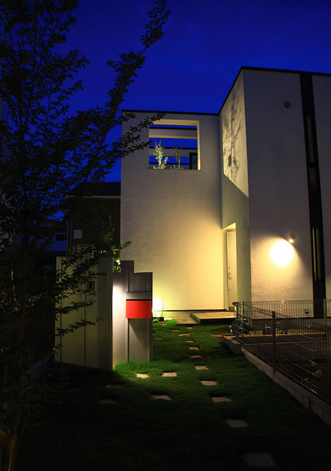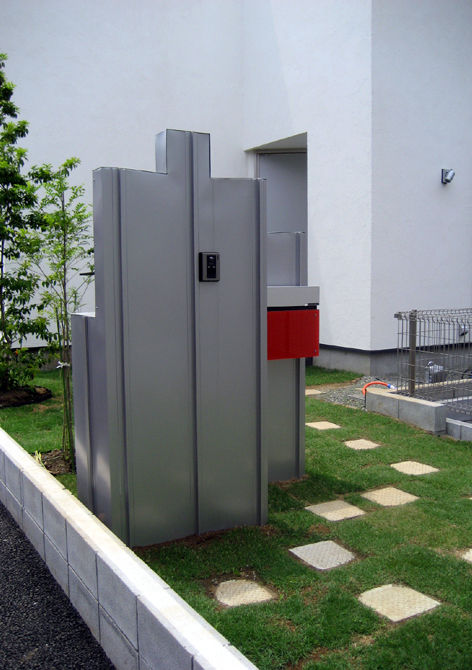 常識的な、駐車場とアプローチという機能だけに終わらせず、庭として、丁度、箱根の彫刻の森美術館のような雰囲気をそこにつくり出そうと計画。夫婦が門のところに立って、ひとを迎い入れるような雰囲気に。彫刻的なオブジェを制作し、ポストとインターホンを取り付けた。この2体のオブジェは、一方で、この家のガードマンとして監視し、周りに囲いがなくてもここの住人を護るという精神的な役目も果たししている。