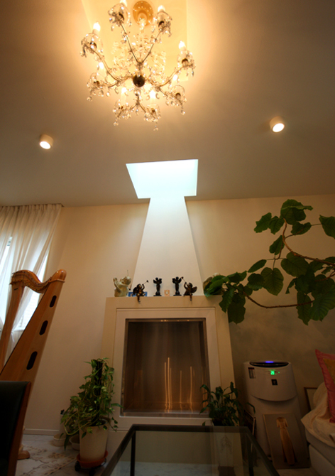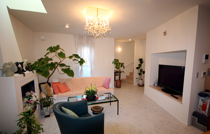 結果として、敷地の狭さにかかわらず、空間的に2階に大きく、LDKとして1つにまとめられたのはこの建物の大きな魅力となっている。玄関の入口からリビングルームに上がると、暖炉があって、それがこの家のシンボルとなっている。暖炉を中心として、TVの位置との関係が無理のないかたちで、椅子を配置することができている。あちらこちらに天使の置き物があって、やさしいニュアンスを与えている。